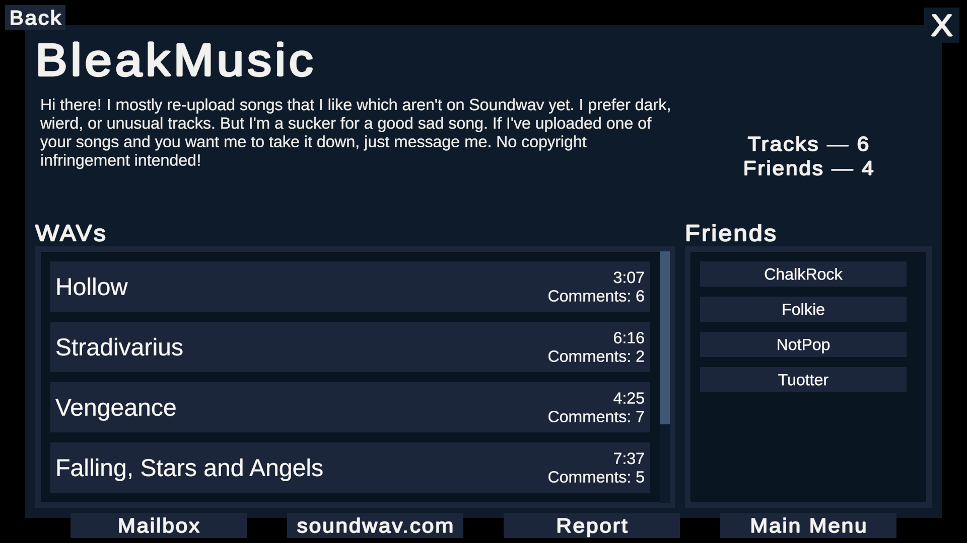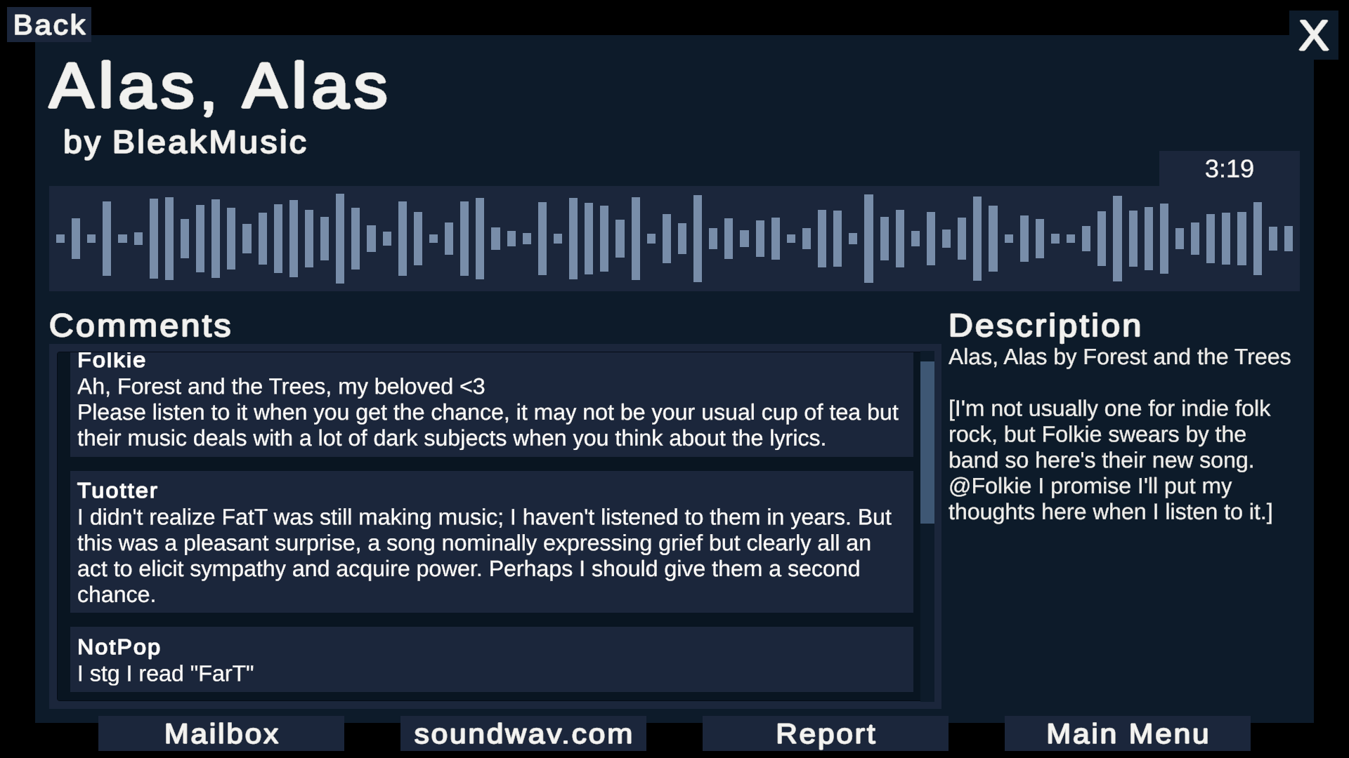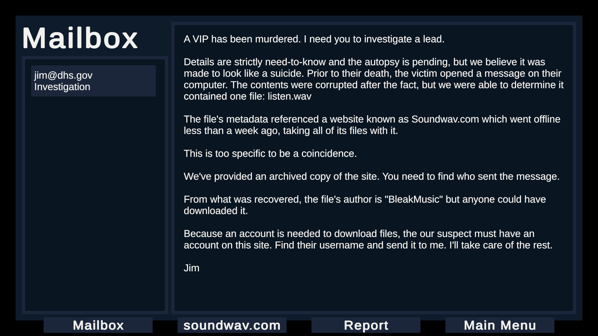 Soundwav is a visual novel mystery that plays out through the archive of a dead music-sharing website. All you can do is read comments and descriptions, search for users, and follow links. With those tools alone you need to determine who sent the file and give the investigation a lead on the culprit.